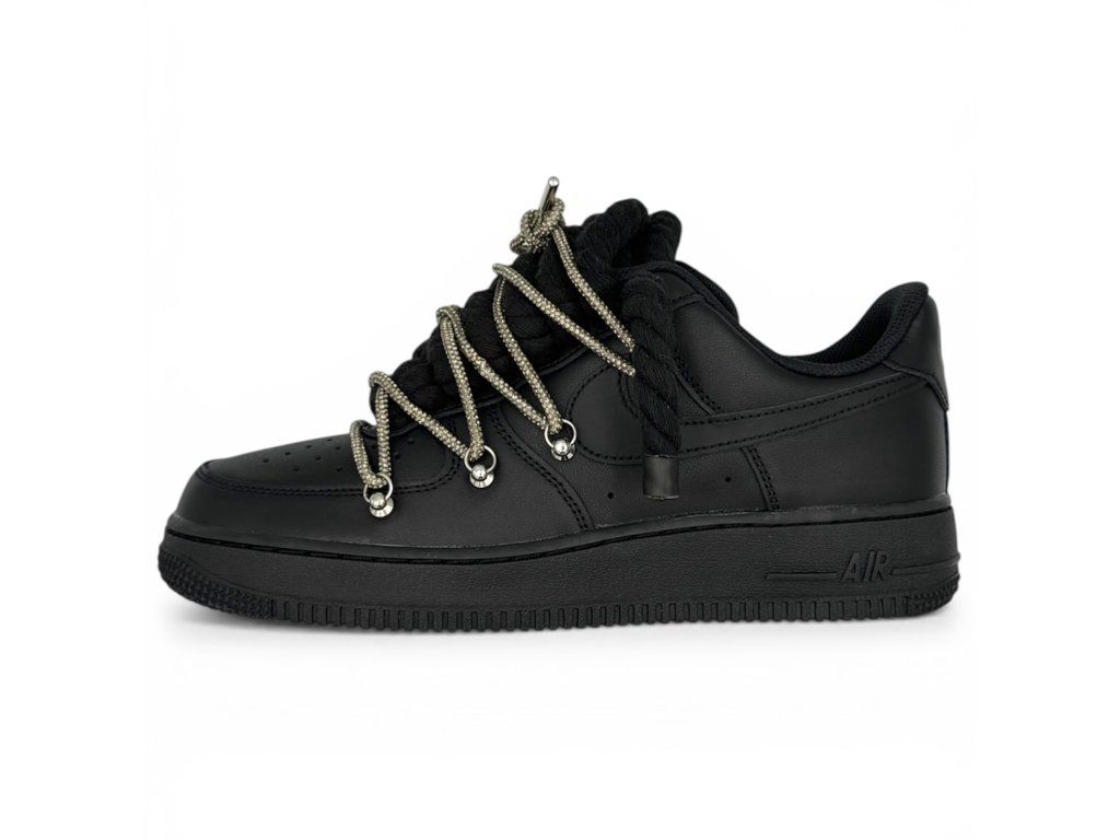 Nike Air Force 1 Low černé s provazovými tkaničkami v černé barvě a třpytivými overlaces v grafitové barvě