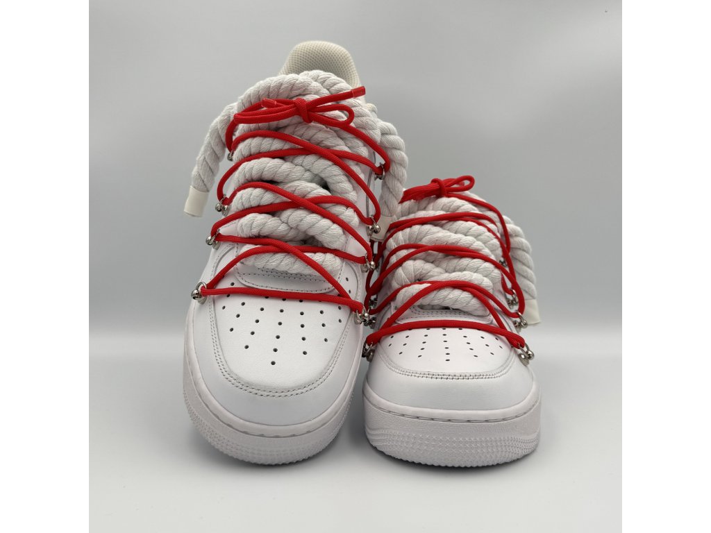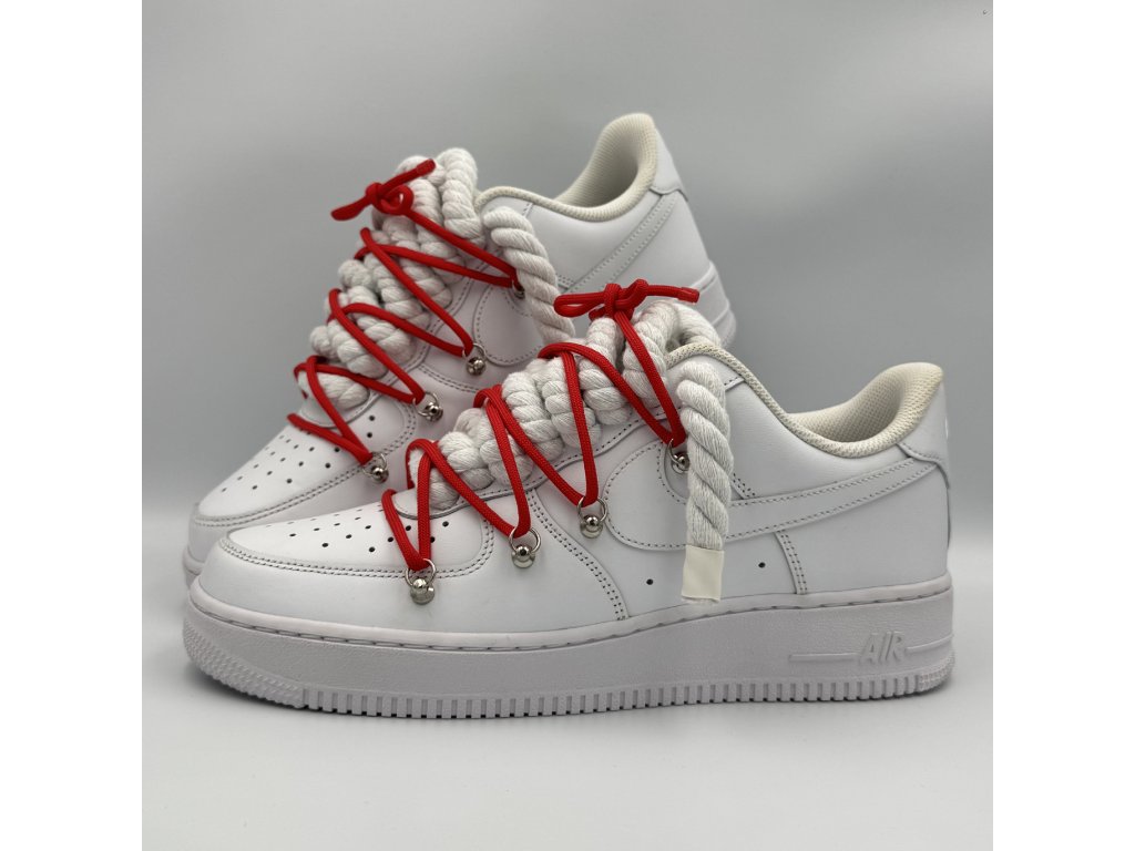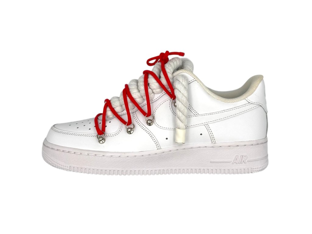 Nike Air Force 1 Low bílé s provazovými tkaničkami v bílé barvě a červenými overlaces
