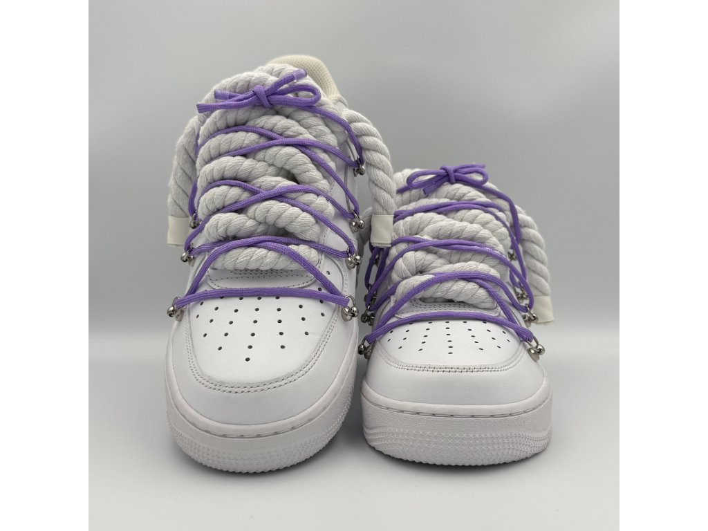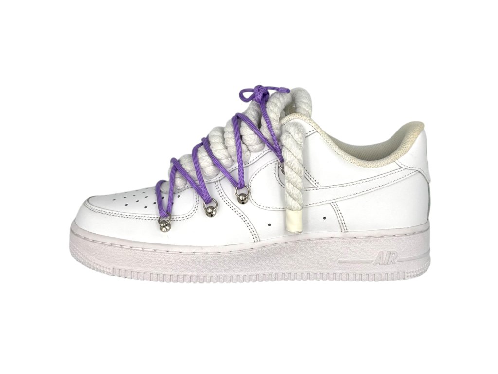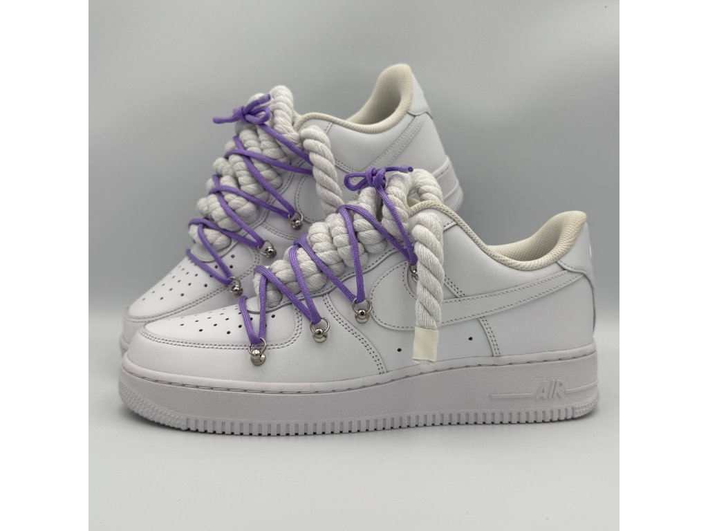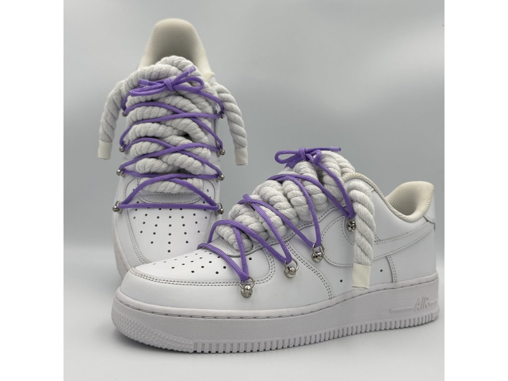 Nike Air Force 1 Low bílé s provazovými tkaničkami v bílé barvě a levandulovými overlaces