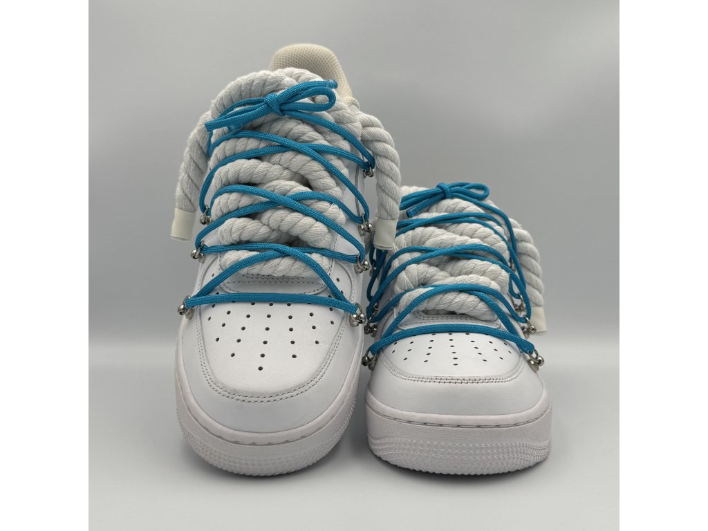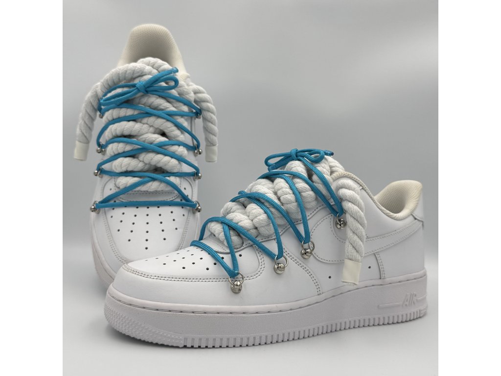Nike Air Force 1 Low bílé s provazovými tkaničkami v bílé barvě a tyrkysovými overlaces