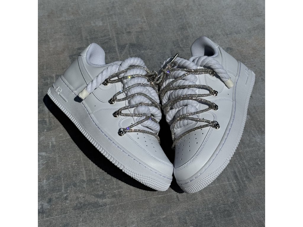 Nike Air Force 1 Low bílé s provazovými tkaničkami v bílé barvě a třpytivými overlaces ve stříbrné barvě